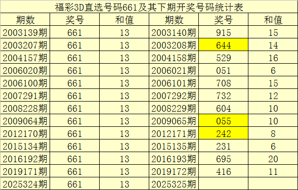 一、开奖讲究:第2025324期福彩3D奖号为661。奖号奇偶比为1:2,和值为:13,跨度为:5。