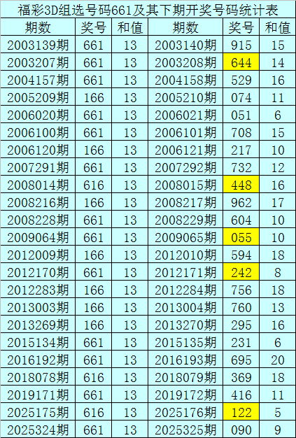 二、组选分析:历史上组选号码661开出了23次,其下期奖号辞别为:915-644-529-074-051-708-217-732-448-962-604-055-594-242-756-760-295-231-695-369-416-122,其开出期数和下期奖号统计为:
