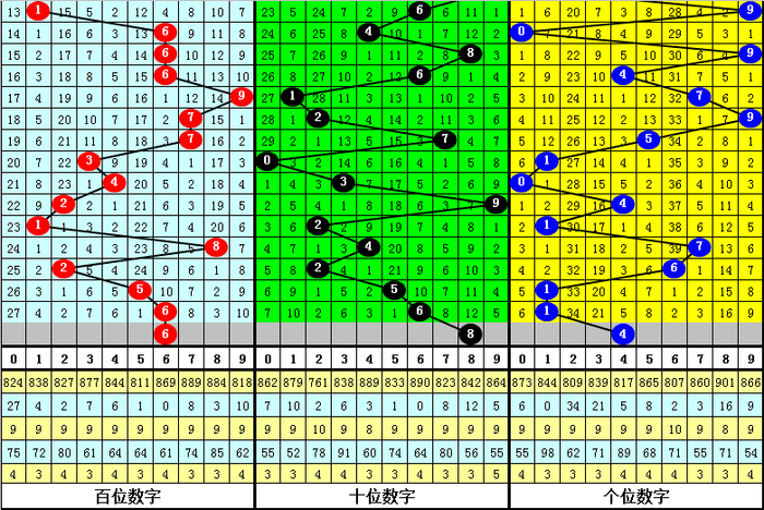 4、组选号码012路比为24:21:32,其中0路号码轮空4期,1路号码轮空6期,2路号码轮空5期,本期012路比参考1:1:1组合。