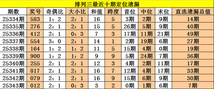 开奖回来:摆设三第2025343期奖号:012,定位直选遗漏值0期、1期、6期,遗漏总值为7期。